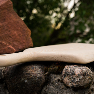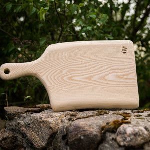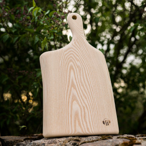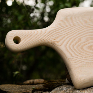 WZÓR nr 5 - deska do serwowania i krojenia - JESION - wykonana z jednego kawałka drewna jesionowego o wymiarach: długość całkowita 49 cm, szerokość ok. 25 cm; - olejowana olejem rzepakowym, -kolor naturalnego drewna