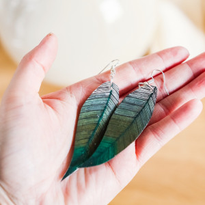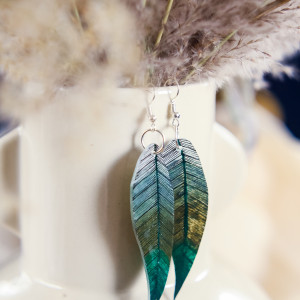 Zostały ręcznie narysowane na specjalnej folii. Powierzchnia listków została zabezpieczona kilkoma warstwami błyszczącego lakieru ekologicznego, dzięki czemu kolczyki ładnie mienią się w słońcu.