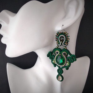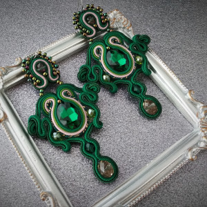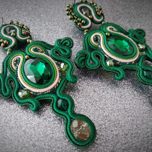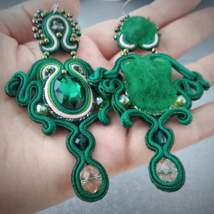 Biżuteria sutasz, to technika w której zostały wykonane te kolczyki. To wymagająca technika haftu. Polega na zszywaniu ze sobą sznurków i nadawaniu im kształtu. Obszywaniu i przyszywaniu koralików i kryształków. Wymaga to precyzji i wielu godzin spędzonych na szyciu. Prace powstałe w tej technice są w 100 % ręczną pracą, prawdziwym rękodziełem. Mnogość kolorów i kształtów, oryginalność i ponadczasowość, elegancja i szyk to właśnie jest sutasz. Sutasz w moim wykonaniu jest w całości szyty ręcznie. Nie kleje sznurków. Nie używam kleju z wyjątkiem podklejenia pracy od tyłu w celu schowania zakończeń sznurków i estetycznego wykończenia. Używam specjalnie do tego celu przeznaczonego kleju. Całość została zaimpregnowana impregnatem do sutaszu na bazie wody w celu uniknięcia zabrudzenia. Jak użytkować biżuterię sutasz? (jeżeli masz pytania to skontaktuj się ze mną) Biżuteria wysyłana w ozdobnym opakowaniu.