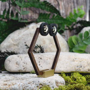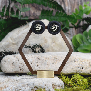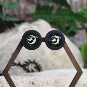Ręcznie wykonane drewniane kolczyki barwione na czarno ze szklanymi kaboszonami z grafikami.