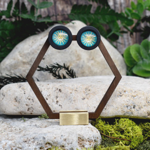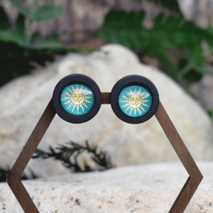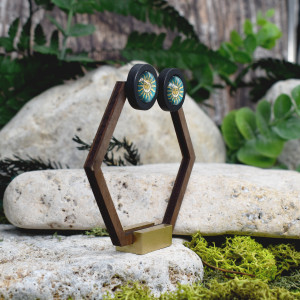 Ręcznie wykonane drewniane kolczyki barwione na czarno ze szklanymi kaboszonami z grafikami.
