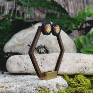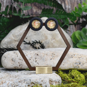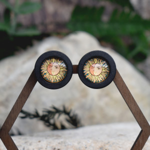 Ręcznie wykonane drewniane kolczyki barwione na czarno ze szklanymi kaboszonami z grafikami.