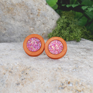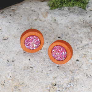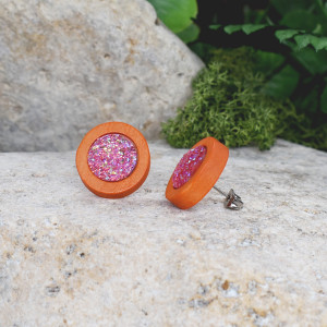 Ręcznie wykonane kolczyki z drewna barwionego na pomarańczowo ozdobione druzami. Idealne do letnich kolorowych stylizacji boho / hippie.