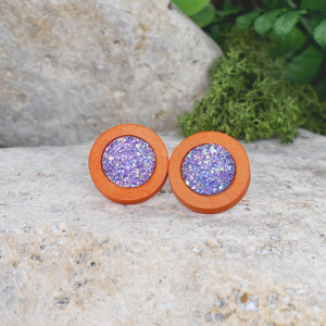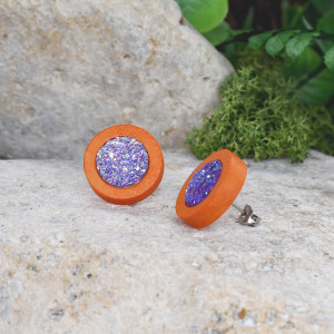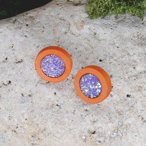 Ręcznie wykonane kolczyki z drewna barwionego na pomarańczowo ozdobione druzami. Idealne do letnich kolorowych stylizacji boho / hippie.
