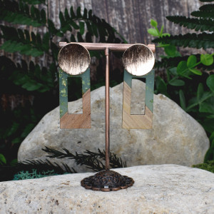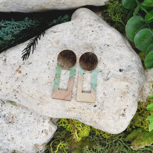 Ręcznie wykonane kolczyki z drewna i zielonej żywicy na ozdobnym sztyfcie w miedzianym kolorze. Idealne do letnich kolorowych stylizacji boho / hippie.