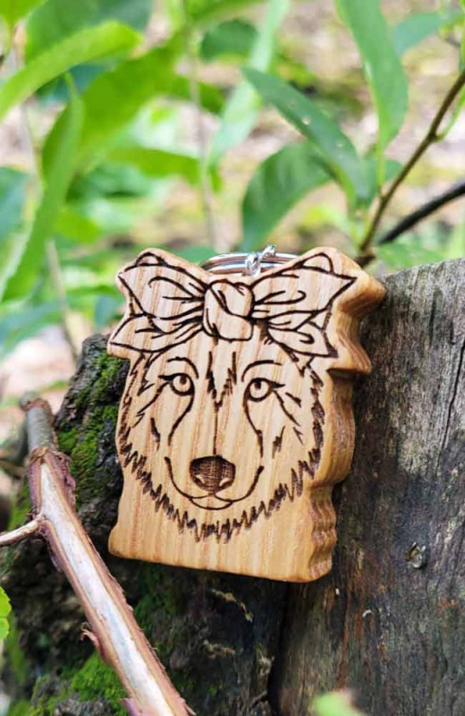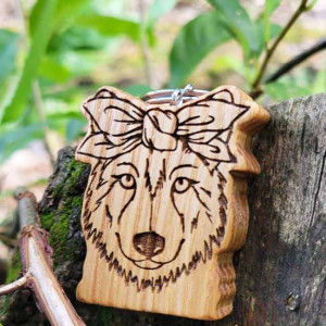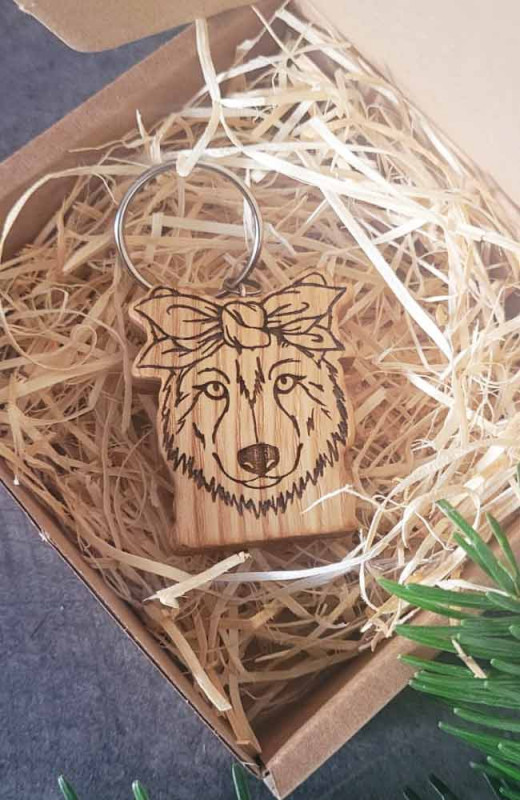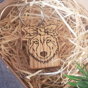 Drewniany brelok "Wilczyca w chustce z kokardą"