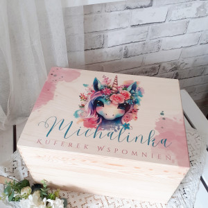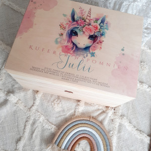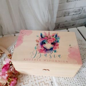 Pudełko z drewna, dostępne jest w 4 wariantach wielkości: małe (30x20x12), kwadratowe (30x30x12), średnie (40x30x12) i duże (40x30x22). Posiadają z boku wycięte uchwyty (z wyjątkiem pudełka kwadratowego). Pomieści wiele skarbów dziecka, albo pierwsze wspomnienia: zdjęcie USG, pierwszą pieluszkę, body, smoczek, zdjęcie z rodzicami. Będzie wspaniałą pamiątką i wspomnieniem dziecka z dzieciństwa. To piękny prezent z okazji narodzin, czy chrztu, do wewnątrz można włożyć kocyk, pościel, bodziaki, itp i skomponować w ten sposób wspaniały prezent dla maluszka.
