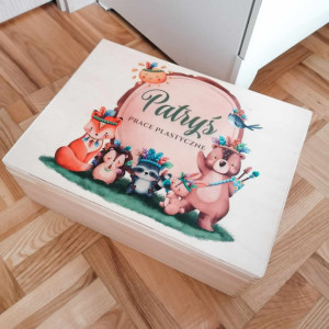 Pudełko z drewna, dostępne jest w 4 wariantach wielkości: małe (30x20x12), kwadratowe (30x30x12), średnie (40x30x12) i duże (40x30x22). Posiadają z boku wycięte uchwyty (z wyjątkiem pudełka kwadratowego). Pomieści wiele skarbów dziecka, albo pierwsze wspomnienia: zdjęcie USG, pierwszą pieluszkę, body, smoczek, zdjęcie z rodzicami. Będzie wspaniałą pamiątką i wspomnieniem dziecka z dzieciństwa. To piękny prezent z okazji narodzin, czy chrztu, do wewnątrz można włożyć kocyk, pościel, bodziaki, itp i skomponować w ten sposób wspaniały prezent dla maluszka.