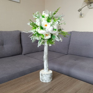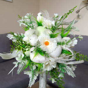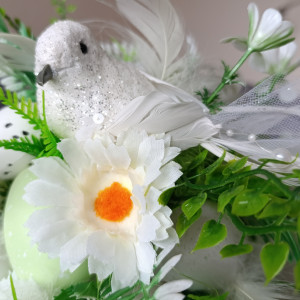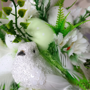Zapraszam do zakupu dekoracji - drzewka wielkanocnego. Stroik na Wielkanoc i wiosnę z białymi, brokatowymi ptaszkami, udekorowany kompozycją z kwiatów sztucznych, pisankami, jajkami, piórkami.