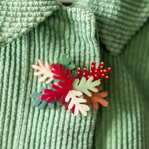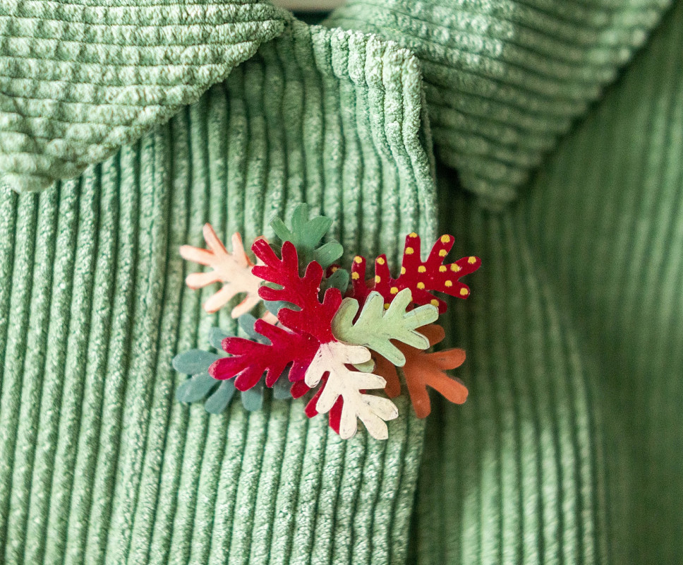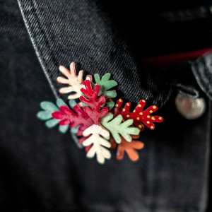 Przypinka jest posklejana z ręcznie rysowanych elementów. Każdy element został polakierowany lakierem ekologicznym. Powierzchnia "listków" jest błyszcząca.