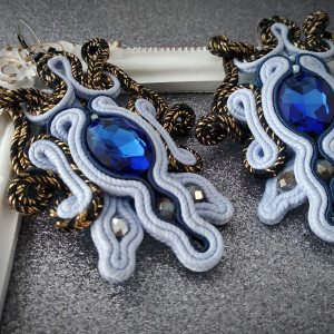 Duże błękitne kolczyki sutasz przełamane kolorem czarnym i złotym. Kolczyki zdobią duże szklane niebieskie kamienie oraz szklane koraliki. Wszystkie materiały są najwyższej jakości.
