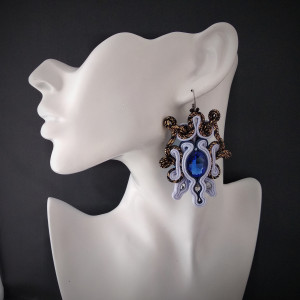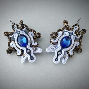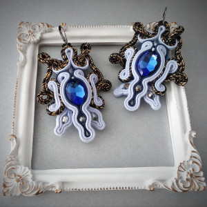 Biżuteria sutasz, to technika w której zostały wykonane te kolczyki. To wymagająca technika haftu. Polega na zszywaniu ze sobą sznurków i nadawaniu im kształtu. Obszywaniu i przyszywaniu koralików i kryształków. Wymaga to precyzji i wielu godzin spędzonych na szyciu. Prace powstałe w tej technice są w 100 % ręczną pracą, prawdziwym rękodziełem. Mnogość kolorów i kształtów, oryginalność i ponadczasowość, elegancja i szyk to właśnie jest sutasz.