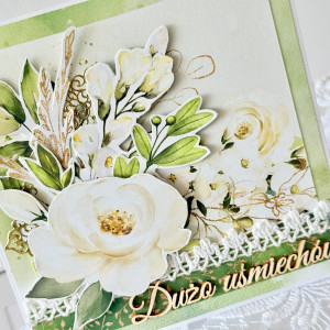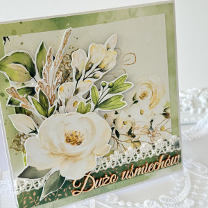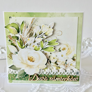 Kartka na każdą okazję. Pełna kwiatów i z napisem dużo uśmiechów.
