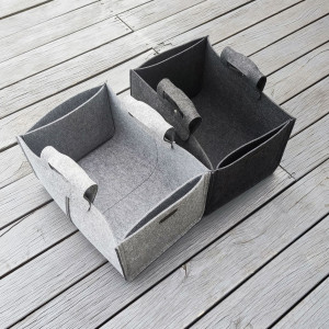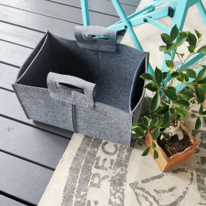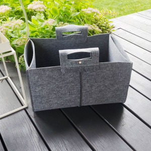 Ten praktyczny kosz filcowy z pewnością docenią rodzice małych bałaganiarzy, gdyż znakomicie nadaje się do przechowywania zabawek. Sprawdzi się jednak równie dobrze jako pojemnik na drewno do kominka lub gazetnik. Do jego wykonania użyliśmy ciętego laserowo filcu, w 100% poliestrowego, którego impregnowana zewnętrzna strona nie będzie się szybko mechacić. Prezentowany kosz z filcu posiada wygodne i solidne rączki do przenoszenia oraz dwie boczne kieszenie. Można zamówić kosz o innych wymiarach.