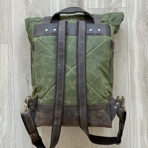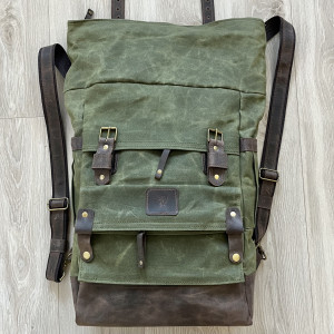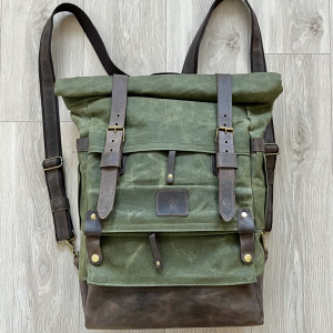 Plecak wyposażony w rączkę i dwa regulowane nośne pasy ze skóry podszyte taśmą parcianą zapinane na karabińczyki.