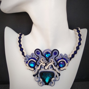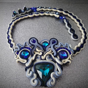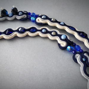 Kolory naszyjnika to odcienie niebieskiego, granatu, szarość oraz jasny żółty.