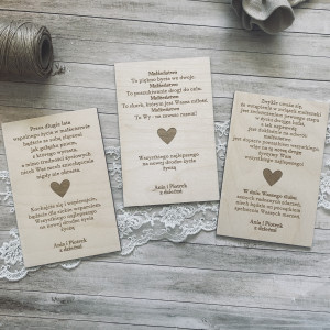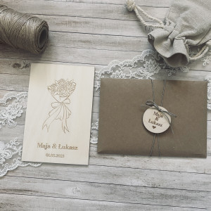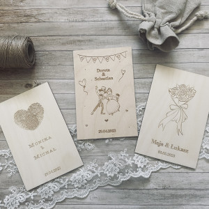 Dwustronna kartka ślubna, grawerowana ze sklejki.
