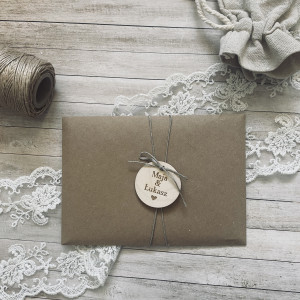 Zapakowana w kraftową kopertę, przewiązana sznurkiem oraz kółeczkiem z imionami pary młodej.