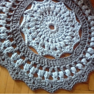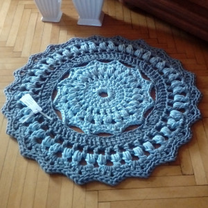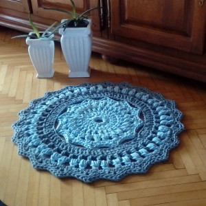 Dywan wykonany ręcznie w kolorach niebieskim i szarym. Średnica 70 cm. Starannie wykonany, zakończony wzmocnionym ozdobnym brzegiem. Zastosowany materiał - 5 mm sznurek w 100% bawełniany, bezpieczny również dla dzieci z alergią. Łatwy w utrzymaniu w czystości, można prać w temp. 30 st, suszyć na leżąco. Autorski projekt i wykonanie. Istnieje także możliwość wykonania dywanu w innym rozmiarze lub kolorze - do uzgodnienia (wówczas cena uzależniona od rozmiaru). Zdjęcie jest wzorem, czas realizacji zamówienia ok 7-14 dni.