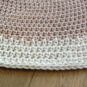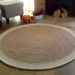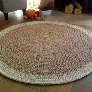 Dywan wykonany ręcznie gęstym splotem. Kolory: kartonowy oraz ecru. Średnica 150 cm. Dywan jest dwustronny, dobrze przylega do podłogi. Ozdobi każde wnętrze, zarówno nowoczesne jak i tradycyjne. Zastosowany materiał - 5 mm sznurek w 100% bawełniany, bezpieczny również dla dzieci z alergią. Łatwy w utrzymaniu w czystości, można prać w temp. 30 st. Autorski projekt i wykonanie. Istnieje także możliwość wykonania dywanu w innym rozmiarze lub kolorze (wówczas cena uzależniona od rozmiaru). Ten dywan to wzór. Czas realizacji zamówienia: ok. 14 - 21 dni