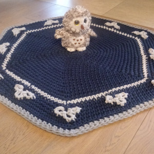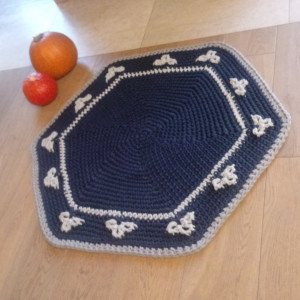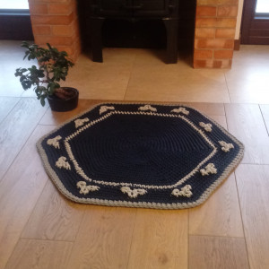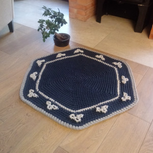 Dywan wykonany ręcznie ścisłym wzorem. Średnica 100 cm, kolory: granatowy i szary. Wkomponuje się w każde wnętrze. Zastosowany materiał - 5 mm sznurek w 100% bawełniany, bezpieczny również dla dzieci z alergią. Łatwy w utrzymaniu w czystości, można prać w temp. 30 st. Autorski projekt i wykonanie. Dywan gotowy do natychmiastowej wysyłki. Istnieje także możliwość wykonania dywanu w innym rozmiarze lub kolorze (wówczas cena uzależniona od rozmiaru).