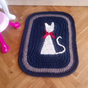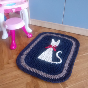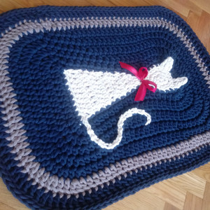 Dywan wykonany ręcznie. Dla miłośników kotów i nie tylko. Wymiary 55 cm x 75 cm. Zastosowany materiał - 5 mm sznurek w 100% bawełniany bezpieczny również dla dzieci z alergią. Sznurek najwyższej jakości wyłącznie od polskich producentów. Łatwy w utrzymaniu w czystości, można prać w temp. 30 st. Autorski projekt i wykonanie. Dywan dostępny na zamówienie, czas realizacji 7-14 dni
