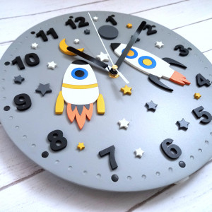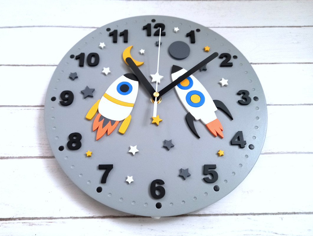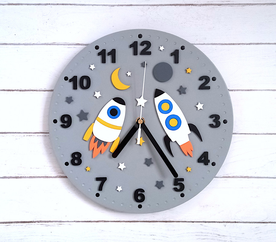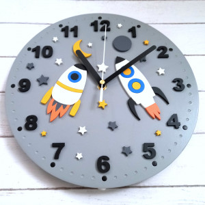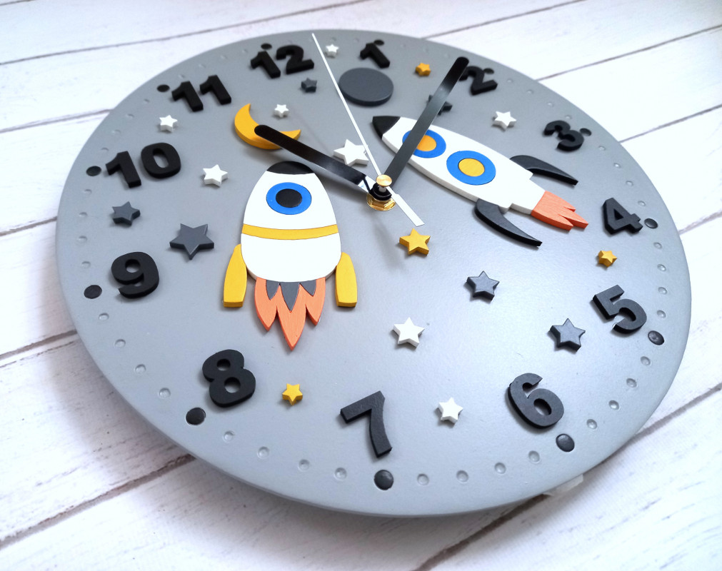 Zegar prezentuje się wyjątkowo i z pewnością będzie miłym i funkcjonalnym dodatkiem do pokoju małego szkraba:) Zegar jest wykonywany i malowny przeze mnie ręcznie w co wkładam dużo serca:) Cyfry, rakiety i pozostałe dodatki są wycięte i naklejone na tarczę co tworzy fajny efekt. Taki zegar może być wspaniałym prezentem dla dziecka. Cyfry oraz wskazówki w kolorze czarnym dobrze się odznaczają co pozwoli dziecku łatwiej nauczyć się odczytywania godzin. Istnieje możliwość wykonania w dowolnej kolorystyce (bez dodatkowych opłat). Średnica tarczy to 27 cm a w zegarze zamontowany został mechanizm bezgłośny, płynący. W mojej ofercie znajdują się również inne wersje kolorystyczne tego modelu :)