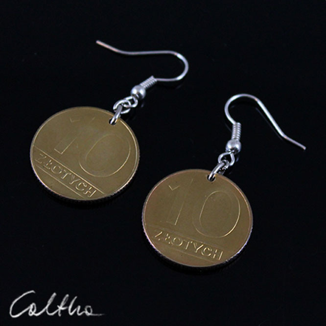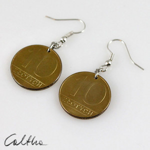 Kolczyki zostały wykonana z monet dziesięciozłotowych. Całkowita długość kolczyka ok 3 cm.