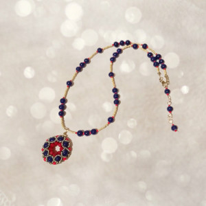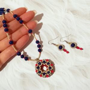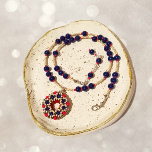 Zdobi go kunsztownie wypleciony wisior donut z kuleczek i drobnych koralików, w odcieniach granatu, matowego srebra i czerwieni, tworzą wyjątkowy wzór, przypominający energetyczny taniec flamenco.