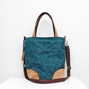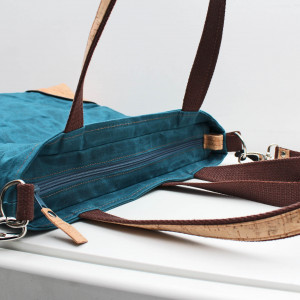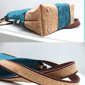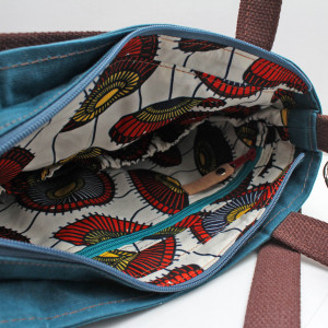 Dla wszystkich dbających o środowisko oraz fanów naturalnych tkanin! Duża torba uszyta została z grubej tkaniny woskowanej (100% bawełna). Podszewka to orginalna przywieziona z Afryki tkanina, która zadrukowana została ręcznie metodą wax print. W środku posiada sporą kieszeń zapinaną zamkiem błyskawicznym oraz dwie kieszonki otwarte wykończone gumką. Dól torby oraz rączki posiadają naszyte elementy z korka. Pasek oraz rączki wykonane zostały z grubej taśmy bawełnianej (100%). Długi pasek z możliwością regulacji oraz odpięcia. Bardzo duża i pojemna, z pewnością pomieści wszystkie skarby :)