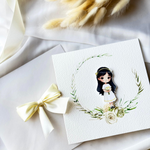 Postać modlącej się dziewczynki jest naklejona przestrzennie i wydrukowana na fakturowanym papierze o gramaturze 245 gram