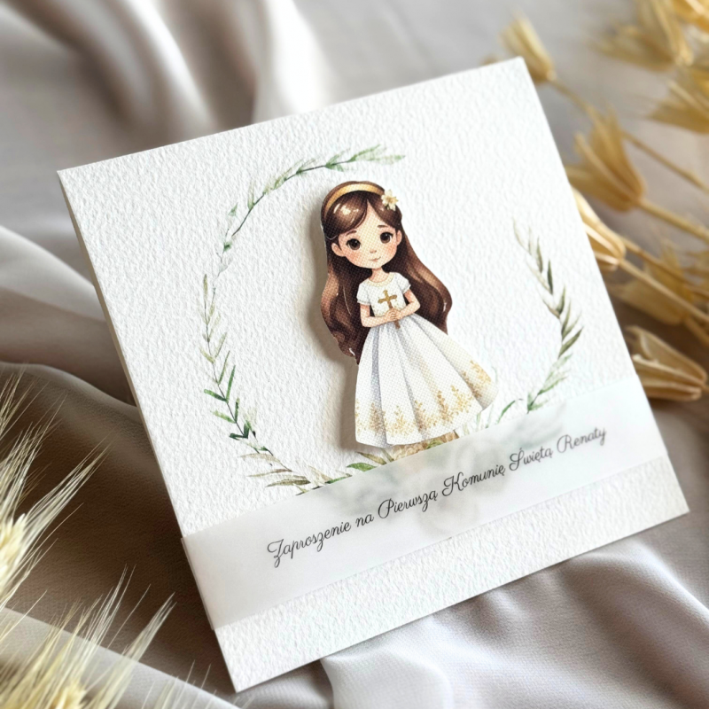 Na przodzie wydrukowany wianek i napis: Zaproszenie na Pierwszą Komunię Świętą (Imię dziecka)
