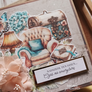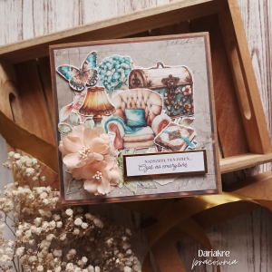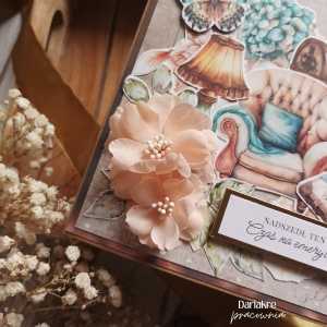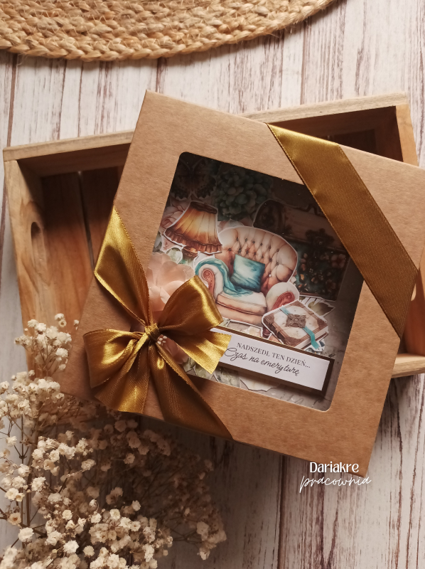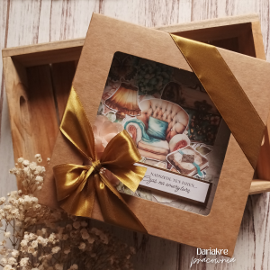 Kartka zapakowana jest w pudełko o wysokości 2,5 cm, 15x15 cm. Pudełko przewiązane wstążką w kolorystyce pasującej do wnętrza kartki. Praca wykonana metodą scrapbookingu, każda z nich jest inna i unikatowa. Jeżeli szukasz wyjątkowej pamiątki dla bliskiej osoby, dobrze trafiłeś/aś, kartka sprawdzi się świetnie jako prezent lub dodatek do prezentu, a zapakowana w pudełeczko będzie efektownym upominkiem.