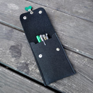 Stylowe etui na długopisy potrafi być nie tylko bardzo przydatnym gadżetem w biurze, lecz również stanowić ozdobę naszego miejsca pracy. Model oferowany przez nas, wykonany został z filcu w kolorze czarnym. Z łatwością pomieści wszystkie potrzebne akcesoria do pisania. Posiada klapkę zapinaną na dwa napy. Elementem ozdobnym jest tutaj zawieszka w kształcie serduszka. Na życzenie bardzo chętnie je jednak zmodyfikujemy. Wybrać można również kolor serca.