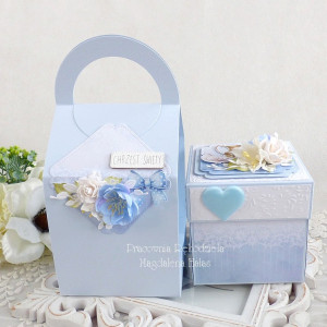 Komplet ozdobiony jest ślicznymi papierami scrapowymi i tłoczonymi polskich producentów, grafikami, uroczym misiem, kwiatami oraz pudełkiem z wieczkiem na pieniądze lub drobny prezent o wymiarach 8x8x3 cm.