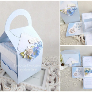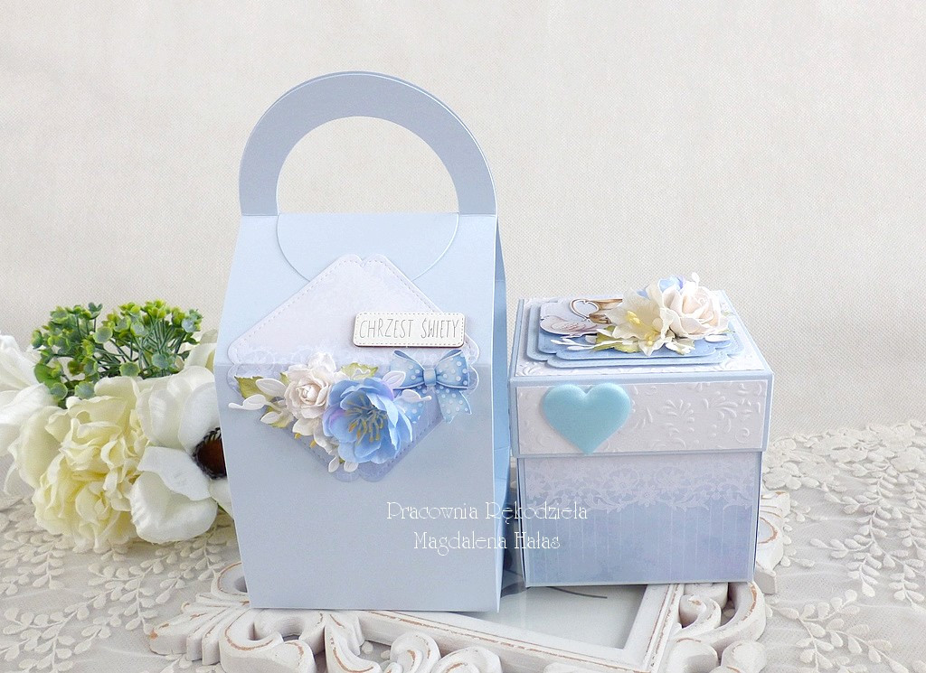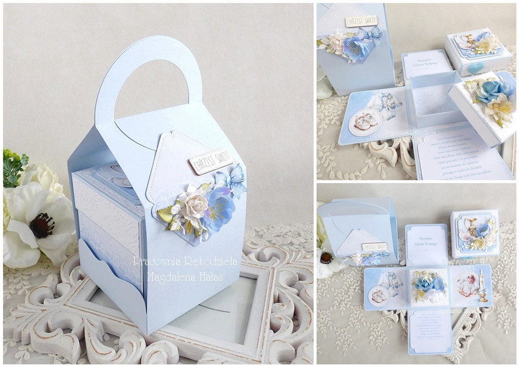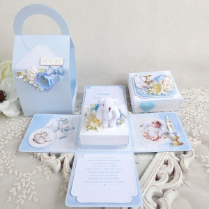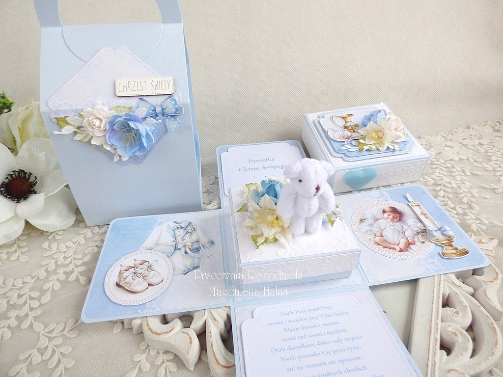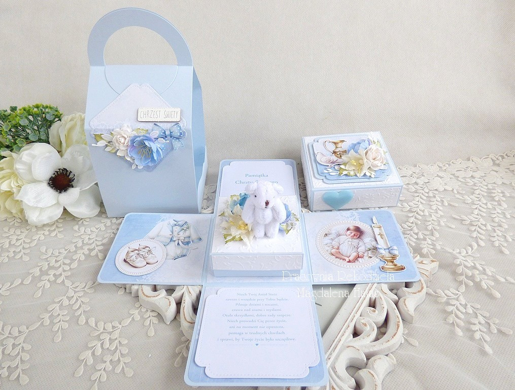 Pamiątka z okazji Chrztu Świętego w formie rozkładanego pudełka - exploding box w udekorowanej torebce.