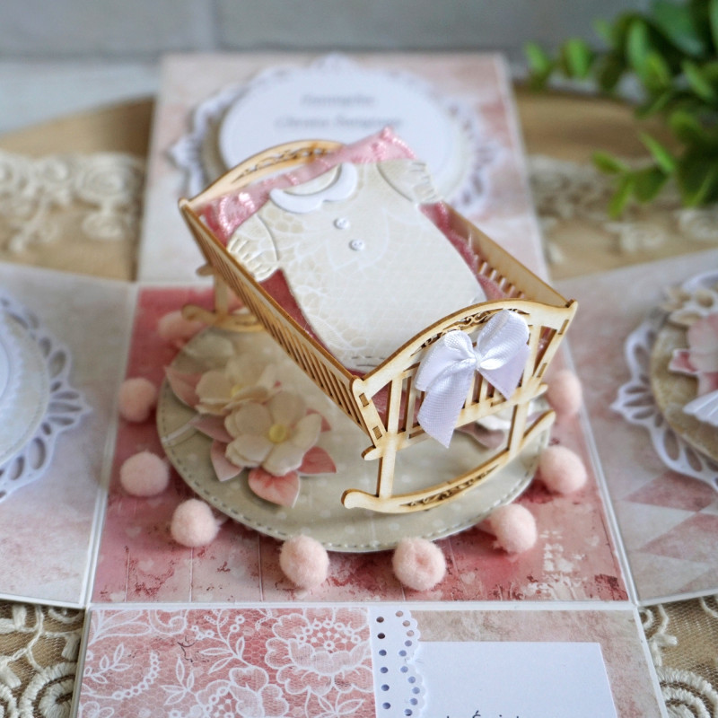 Środek pudełeczka zdobi kołyska z uroczą kokardką, a w niej bodziak.