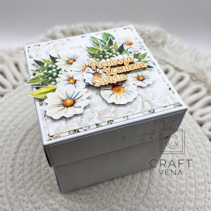 Pudełko eksplodujące (exploding box), to pomysłowa i piękna pamiątka na lata. Na wieczku tekturka i kompozycja papierowa. Po zdjęciu wieczka, ścianki opadają, ukazują wnętrze,, w którym umieściłam: