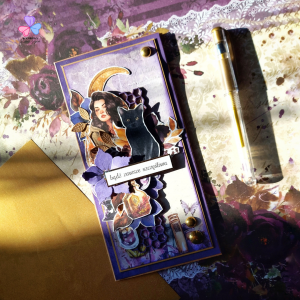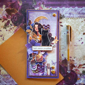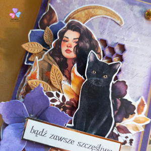 W głównej części kartki znajduje się grafika czarnowłosej kobiety, obok której mamy czarnego kota. Oprócz tego na kartce znajdują się takie magiczne elementy jak sierp księżyca, książki, eliksiry oraz list z pieczęcią. Po lewej stronie widać fioletowy kwiat. Na kartce został umieszczony też napis "bądź zawsze szczęśliwa" - jest to napisy przykładowy. Możliwość pełnej personalizacji.