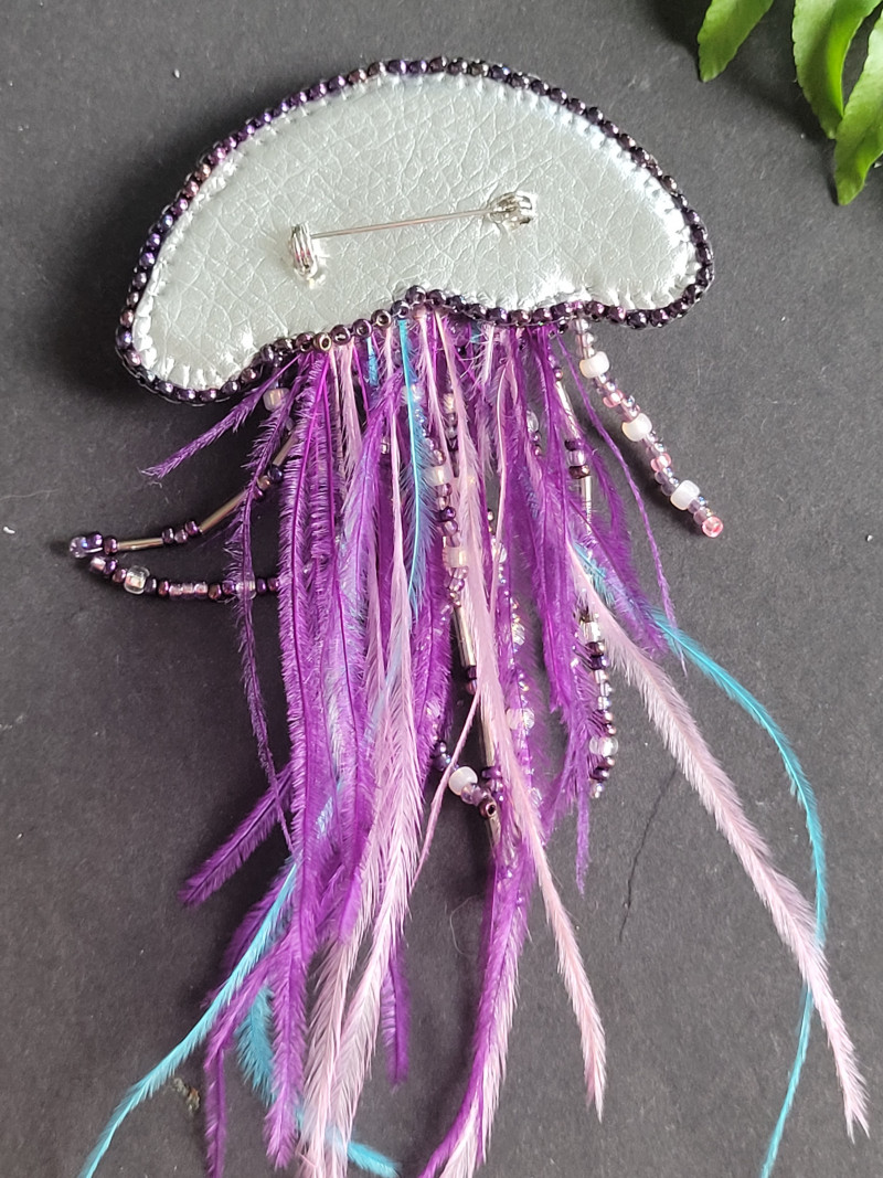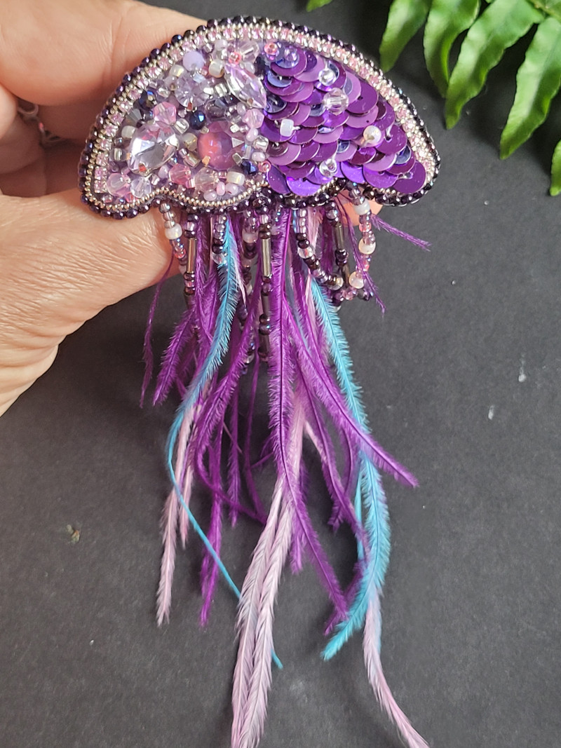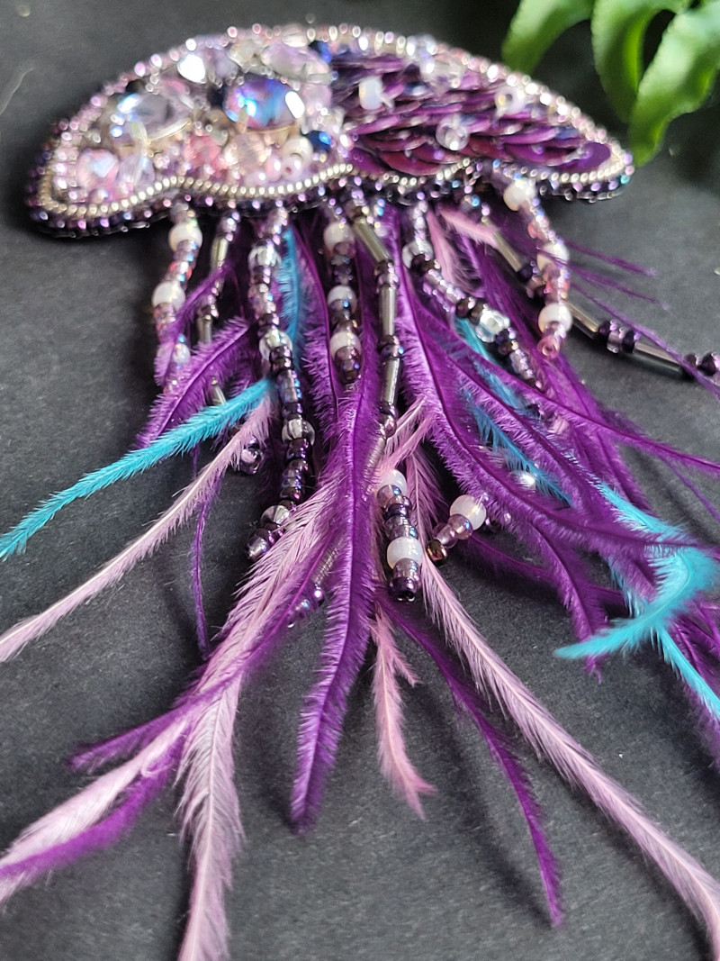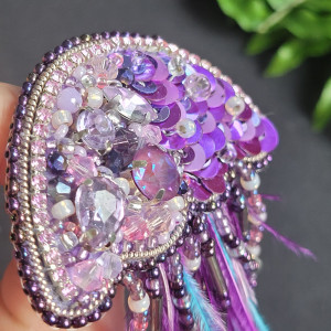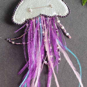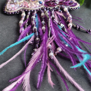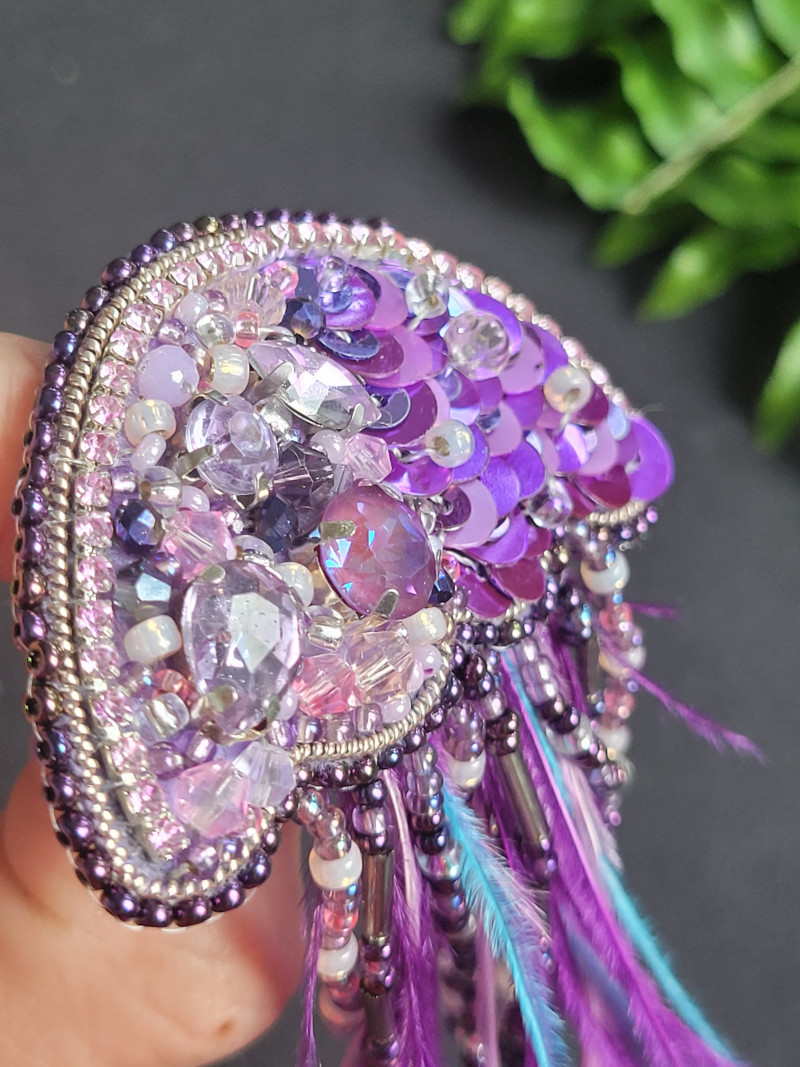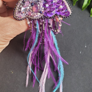"Fioletowa Meduza" broszka koralikowa z piórami i cekinami
