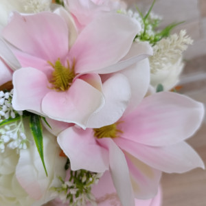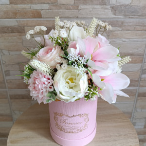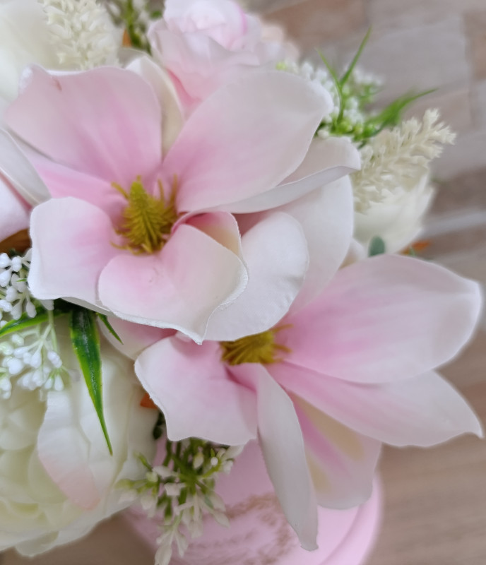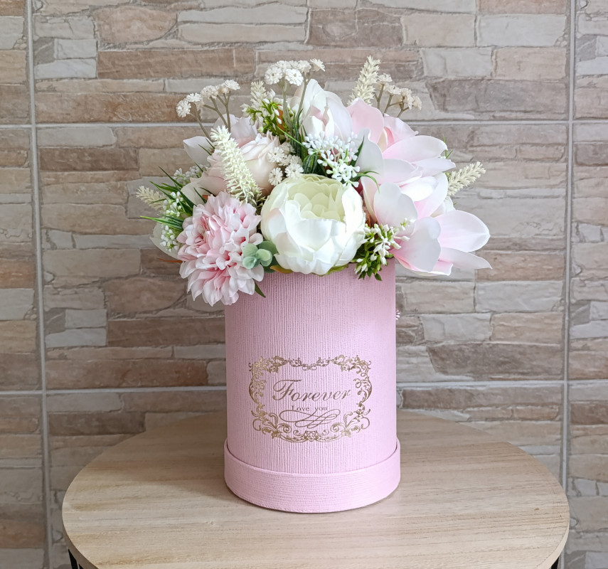 Zapraszam do zakupu dekoracji w eleganckim, różowym flower boxie ze złotymi napisami. Stroik udekorowany kompozycją z kwiatów sztucznych m.in. różami, daliami, piwoniami, magnoliami, dodatkami. Tylko do wewnątrz, stroik nie jest dekoracja nagrobną. Wysokość max. ok. 31 cm Sam box: 18 cm x 14 cm Dekoracja wnętrz idealna do przystrojenia domu, biur, recepcji. Dodatkowo stroik ten może być wspaniałym pomysłem na prezent na rozmaite okazje: Dzień Mamy, urodziny, imieniny, podziękowanie, jubileusz, wprowadziny. Stroik ten jest udekorowany i wykonany według mojego pomysłu. Kolory w rzeczywistości mogą nieznacznie różnić się od tych na zdjęciach, może wpływać na to m.in.ustawienie ekranu. Zapraszam na moje pozostałe ogłoszenia, gdzie znajdą Państwo mnóstwo innych modeli.