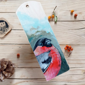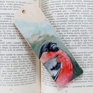 Na zakładce namalowany jest 100% ręcznie farbami akrylowymi śliczny ptak gil (jest to jedyna i niepowtarzalna sztuka, nie nadruk ani decoupage).
