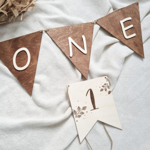 Girlanda na roczek z napisem "ONE" oraz proporczyk z cyferką "1"