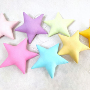 Girlanda ma długość ok. 150 cm (gwiazdki rozmieszczone są na długości ok. 100cm) i składa się z 7 ozdób - gwiazdek w pastelowych, tęczowych kolorach