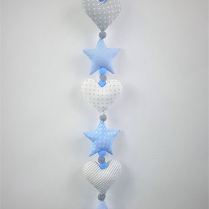Pionowa girlanda ma długość ok. 120 cm i składa się z 10 ozdób (gwiazdki i serduszka) w kolorystyce błękitu, szarości i bieli - elementy w kropeczki oraz paseczki