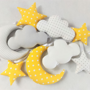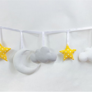 Girlanda ma długość ok. 150cm i składa się z 9 ozdób (chmurki, gwiazdki, księżyce) w kolorach: żółtym, szarym i białym, elementy w kropeczki, paseczki i elementy gładkie