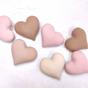 Girlanda ma długość ok. 125 cm i składa się z 7 ozdób (serduszka) w naturalnej kolorystyce: beż, jasny brąz, brudny róż, nugat