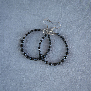 Kolczyki ze szklanych koralików w kolorze czarnym oraz grafitowym/hematytowym.