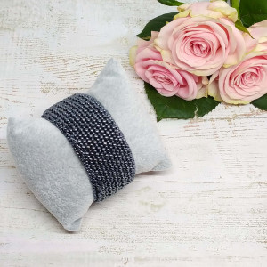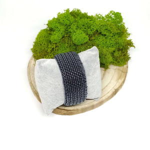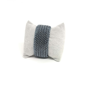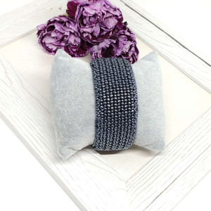 Bransoletka umieszczona została na metalowej bazie, co pozwala swobodnie dopasowywać ją do kształtu nadgarstka. Całość podszyta eko zamszem w kolorze czarnym, który delikatnie otula nadgarstek.