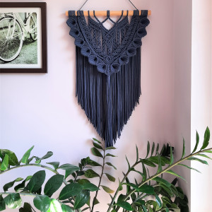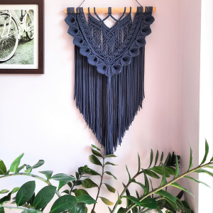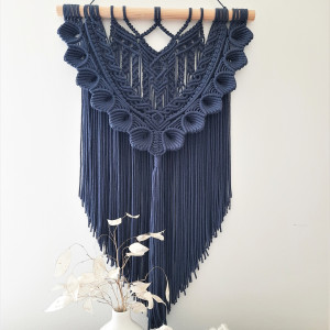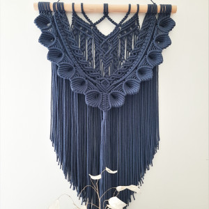 Makrama ścienna w kolorze granatowym. Świetnie sprawdzi się we wnętrzach w stylu boho czy skandynawskim dodając im charakteru i oryginalnośći. Naturalne materiały z których wykonana jest dekoracja ocieplą domowe wnętrze.